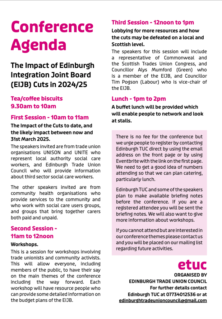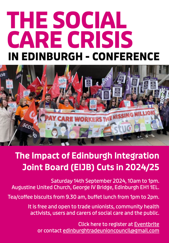 The Social Care Crisis in Edinburgh – Conference Posted byeileenaeipAugust 19, 2024August 23, 2024Posted insocial careTags:AnotherEdinburghIsPossible, care crisis, Edinburgh, saveourcarehomes, social care An important conference organised by Edinburgh Trade Union Council. Register here. Share this: Click to share on X (Opens in new window) X Click to share on Facebook (Opens in new window) Facebook Like Loading... Related