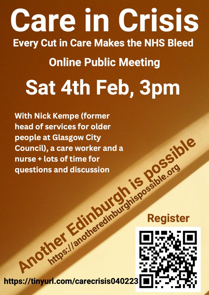 - The council meeting on 22nd February is crucial. Last year at that meeting there was no mention in the budget discussions of the fact that the council might have to bail out the Edinburgh Integration Joint Board. Social care in the city is the council’s responsibility and we should insist that the council takes that responsibility and develops a plan and a budget to get the care service back on track.