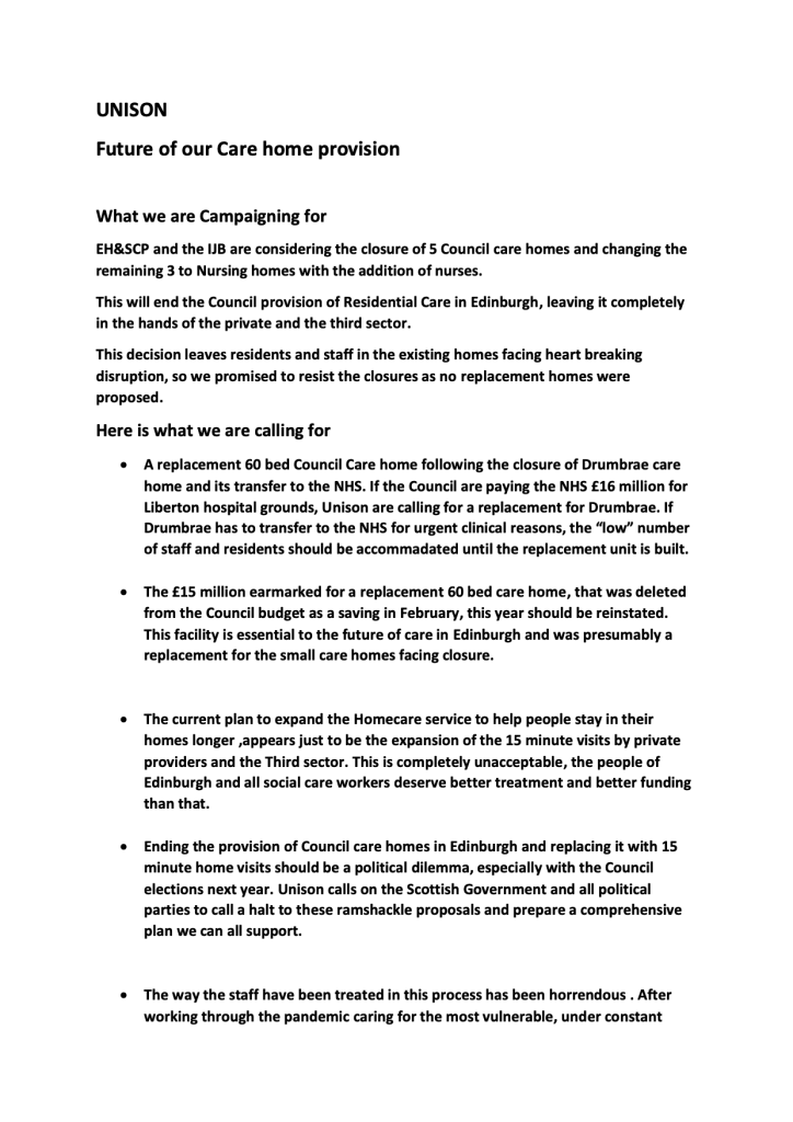 I am writing to request that you join the council unions and the families of residents in making a stand against the proposal to close five publicly run residential care homes in Edinburgh.