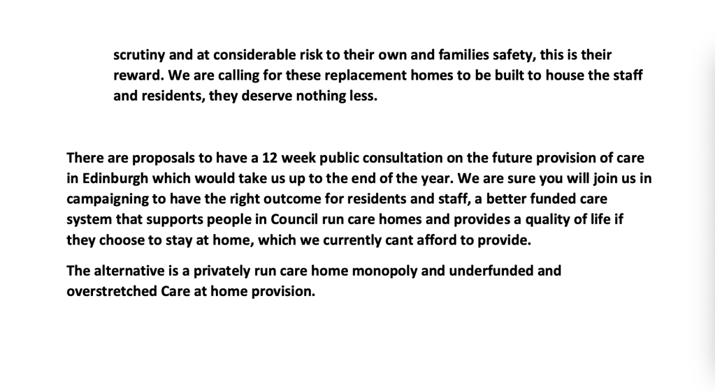 Saving the homes is the first priority of the campaign but in doing so we are also fighting for the future of care in Scotland. We have written to the leaders of all the political groups on the council asking that their group makes a clear, public statement of opposition to the closures.