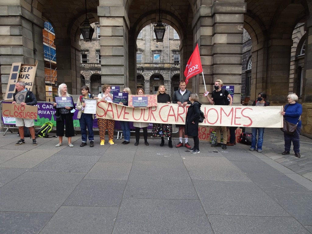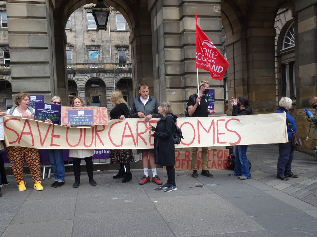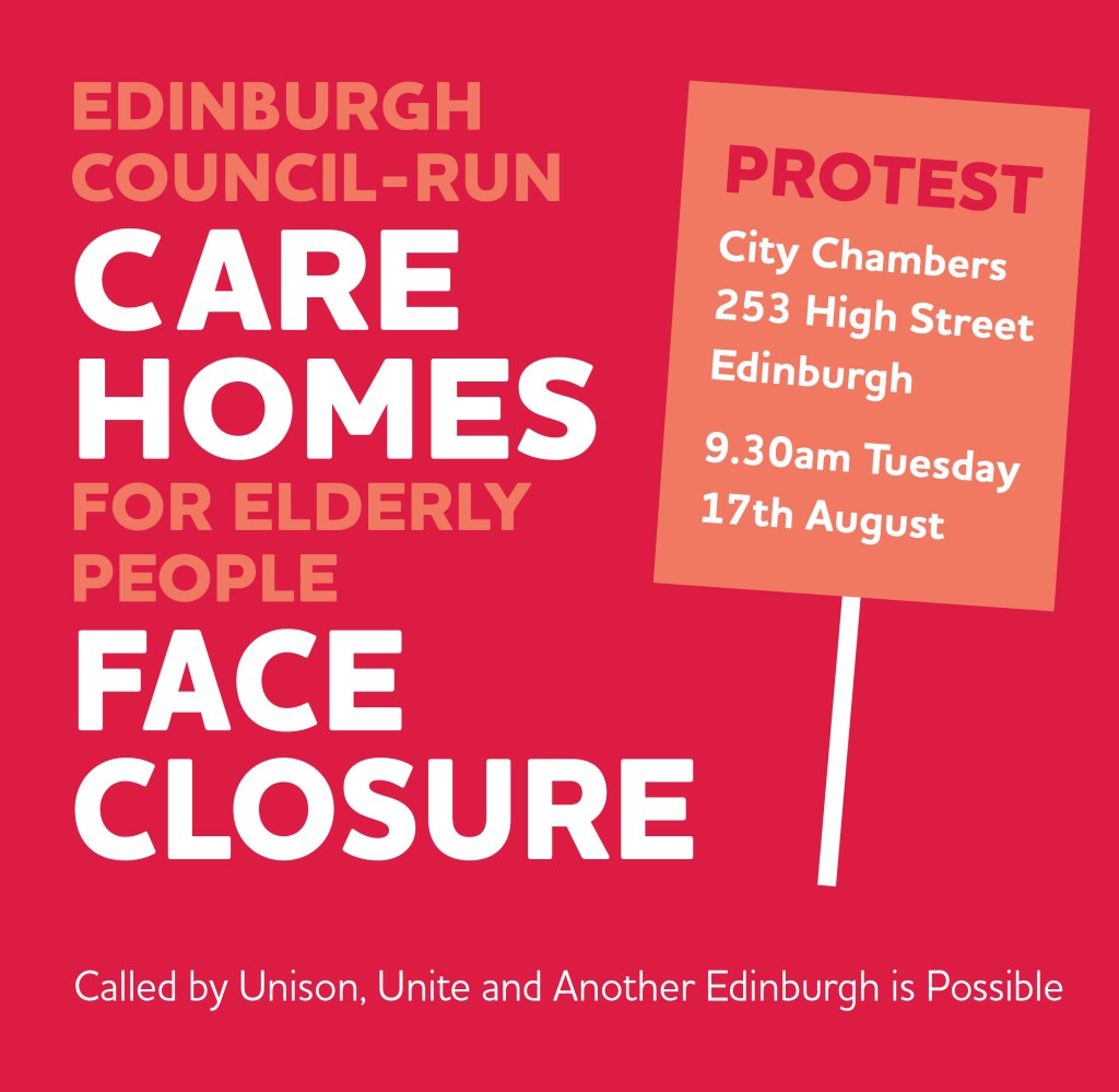 Join the protest rally outside the City Chambers as the Edinburgh Integrated Joint Board meets on Tuesday 17th August. It’s likely that the board will hold a special meeting in September to make the decision to close 5 out of the 9 local authority care homes inn Edinburgh. We want to build a campaign that is so strong that when that meeting takes place the board has no option but to drop its’ closure plans. Three Edinburgh City Councillors sit on the board. We’ve written to the leaders of all five party groups on the council demanding that their group takes a clear and unambiguous public position in opposition to the closures.