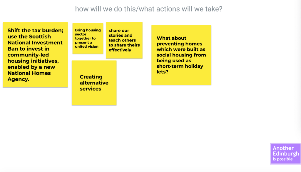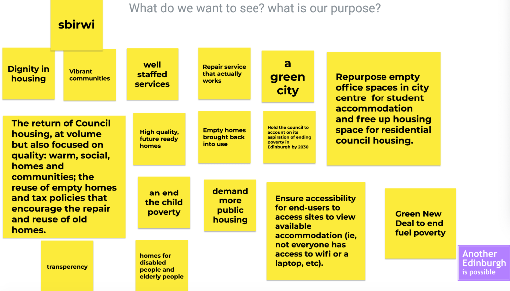 This is a report of the meeting on Housing and Homelessness in Edinburgh, which we held on 22nd April 2021. In our recent survey of how Edinburgh residents feel about councils services just under a half felt that housing services were poor and a similar proportions were unhappy with support for the homeless. In the rest of this post you can find a video record of all the contributions and then the outputs from the discussion groups.